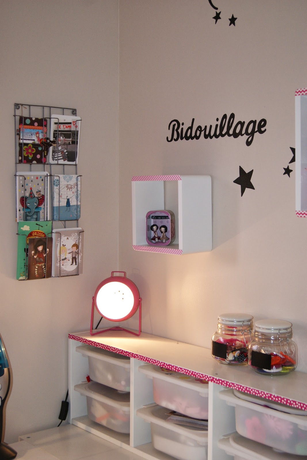 rideaux de chaque coté de la table fait maison... avec des poches pour ne pas perdre mes ciseaux, mon mètre... et tout retrouvez en 30 secondes ! et accessoirement ça cache le bazar du dessous malgré le rangement dans les cases des étagères ^^